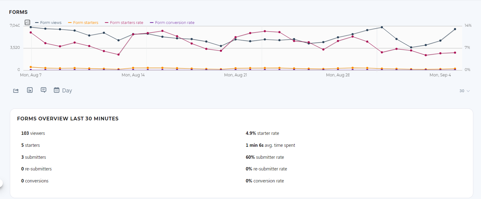 The bar chart represents the % of users that started to fill out a form vs. the % of users that completed a form over time. A snippet also shows form related information over the last 30 minutes which includes the count of visitors that viewed the form, started to fill out the form, completed the form, etc.