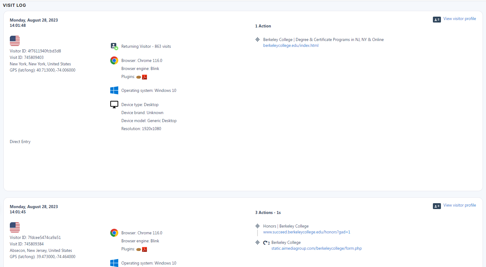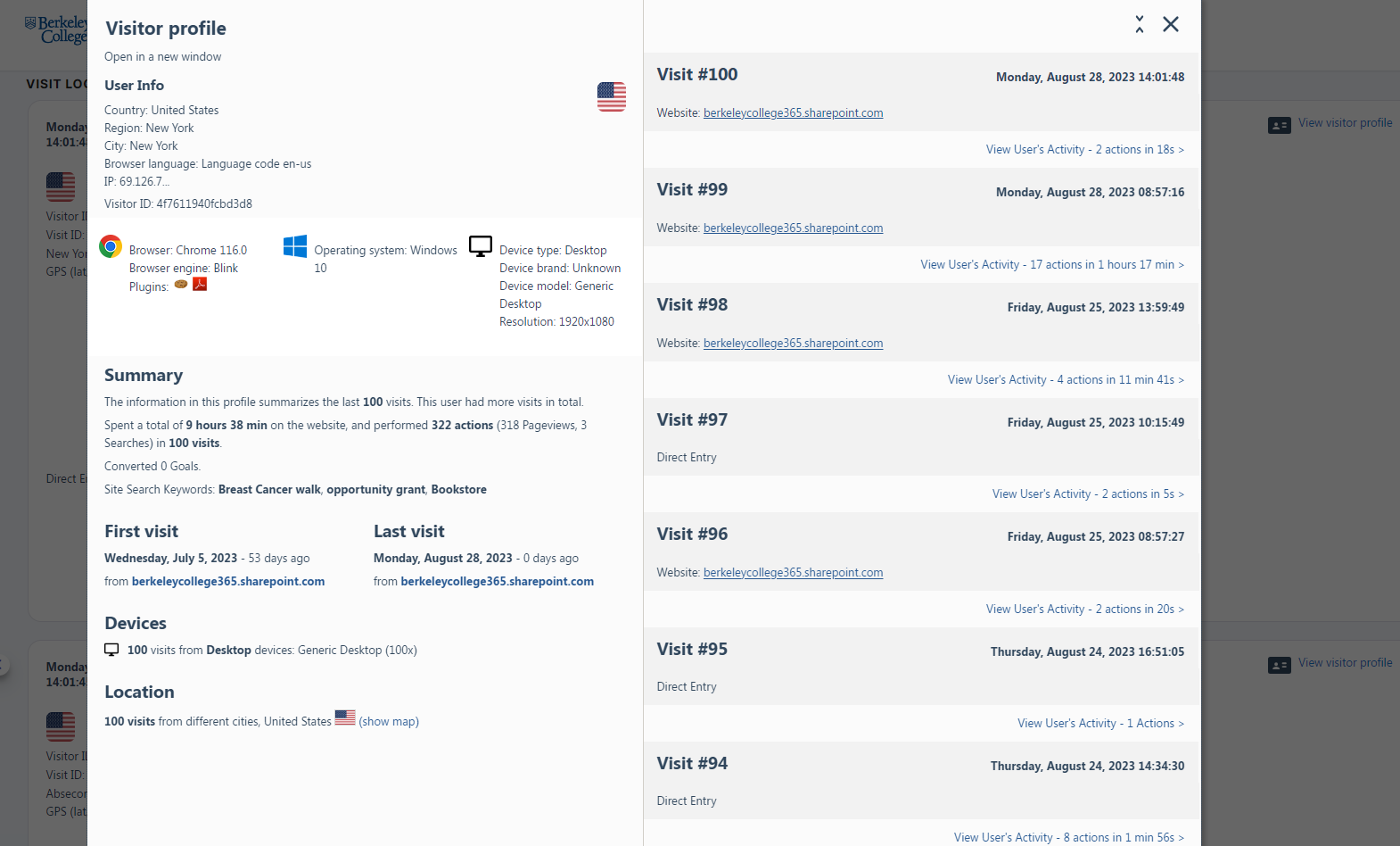 This component is a more detailed rolling log of users profiles that have come to a user’s website. The log keeps track of a profiles location, web browser, device, operating system, and full user path on the website.